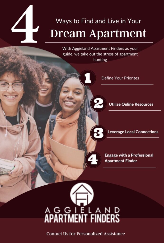 Finding and living in your dream apartment is a journey that requires careful planning and consideration. By defining your priorities, utilizing online resources, leveraging local connections, and engaging with a professional apartment finder, you can enhance your apartment-hunting experience and increase your chances of finding the perfect place. Let Aggieland Apartment Finders be your guide on this exciting adventure. Contact us today for personalized assistance in your quest for the ideal apartment.